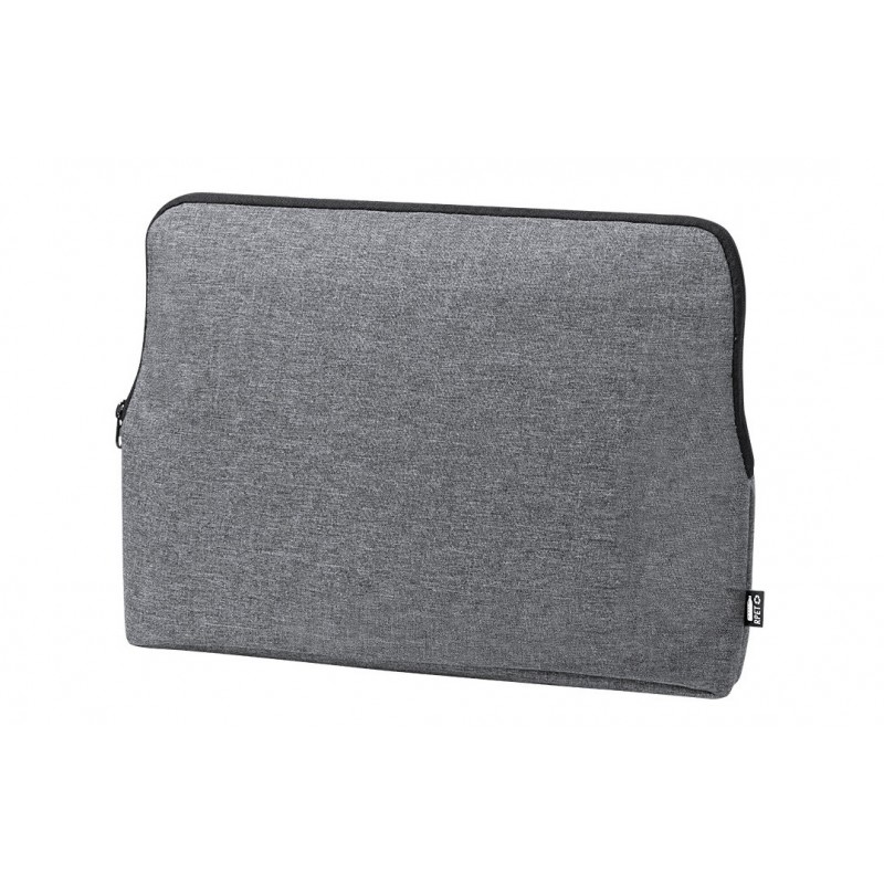 Funda para ordenador portátil de línea nature y en resistente 600D RPET efecto melange, elaborado a partir de plástico reciclado para así fomentar la reutilización de residuos plásticos y contribuir a la sostenibilidad del planeta. Detalles en negro y compartimento principal con cierre de cremallera. Interior totalmente acolchado y forrado.