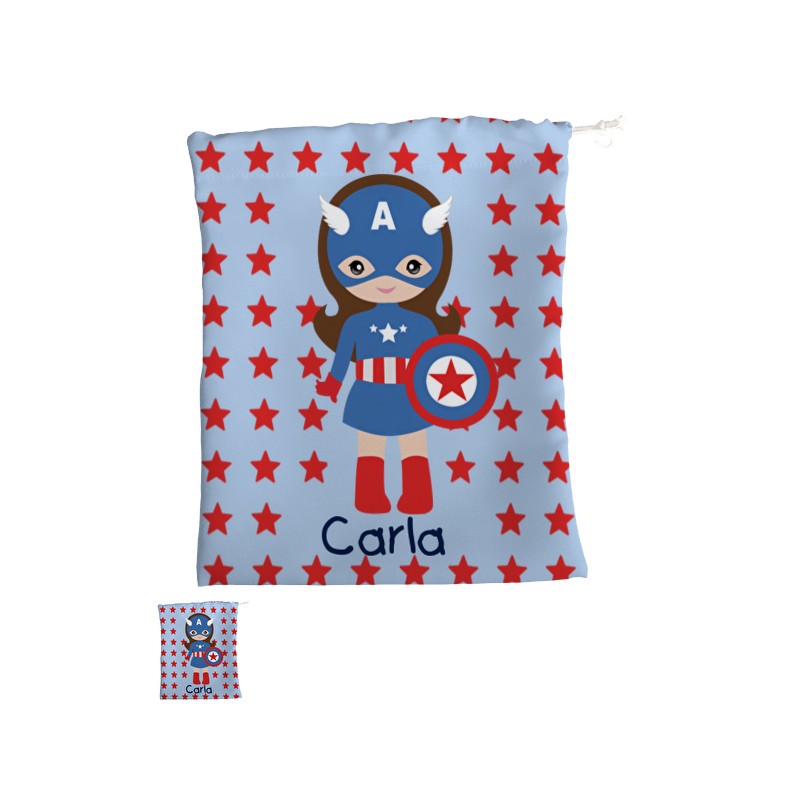 Esta bolsa de tela de merienda personalizada es ideal para que los peques puedan llevar su tentempié al cole. Tiene el tamaño perfecto y una capacidad de dos litros, aproximadamente. Además tiene el cierre con cuerda, para una mayor seguridad y que así no pierda nada durante su transporte.