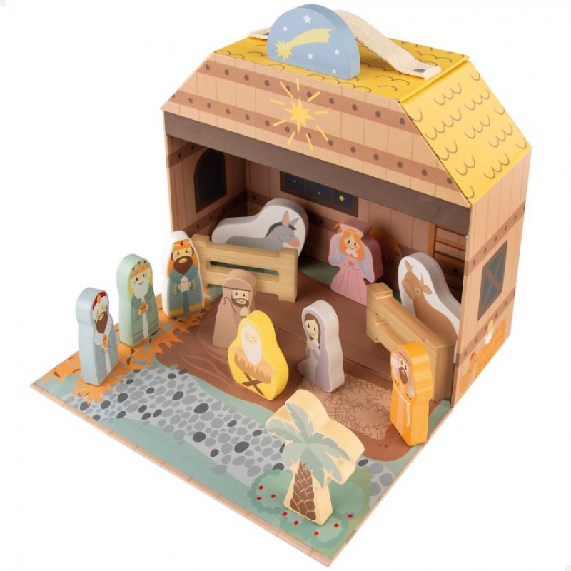 El belén va equipado con 14 piezas de madera. Entre ellas, encontramos a María, José, el niño Jesús, los 3 Reyes Magos (Melchor, Gaspar y Baltasar), 1 pastorcito, 1 ángel, 1 mula, 1 buey, 1 palmera, 1 estrella fugaz y 2 vallas. El propio maletín, al abrirlo se convierte en el pesebre y está decorado con el portal, las estrellas y el camino... ¡Hasta simula la paja del techo! Incluye un asa para transportar cómodamente el maletín.