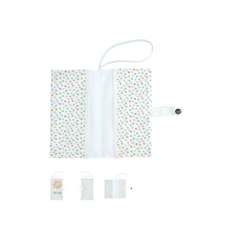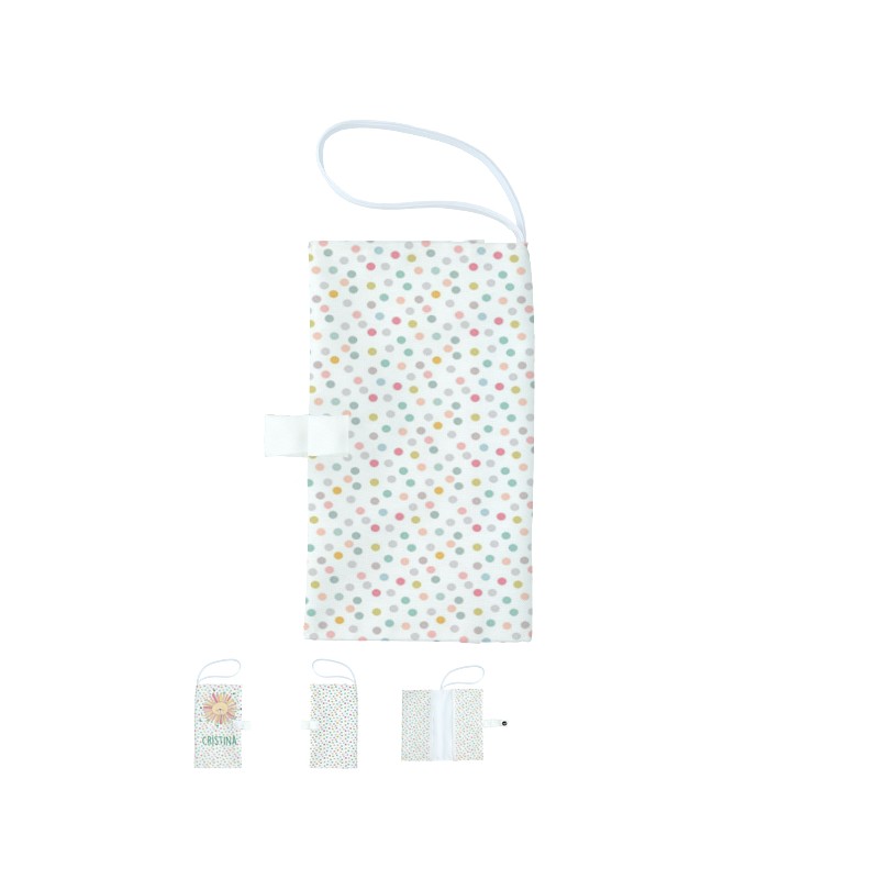 Se cierra con clip, y tiene 2 bolsillos laterales para guardar los pañales. El interior es impermeable.