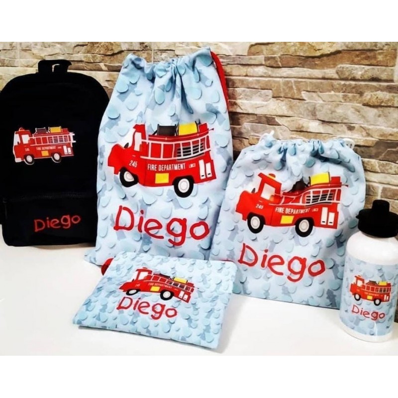 Está compuesto por Mochila para Ed. Infantil, bolsa para la ropa, bolsa de almuerzo, cantimplora y neceser.