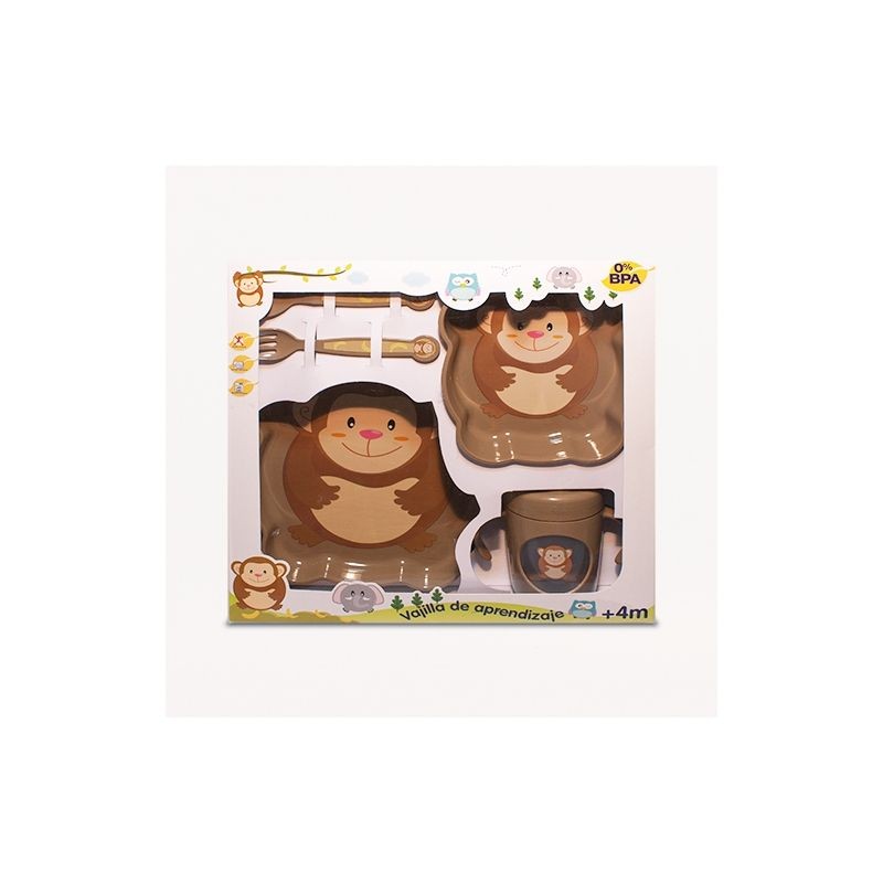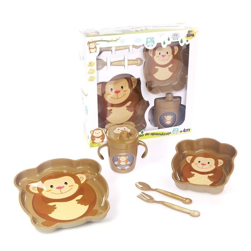 1 plato llano + 1 un plato hondo + 1 vaso con tapa y asas para líquidos + cuchara + tenedor.